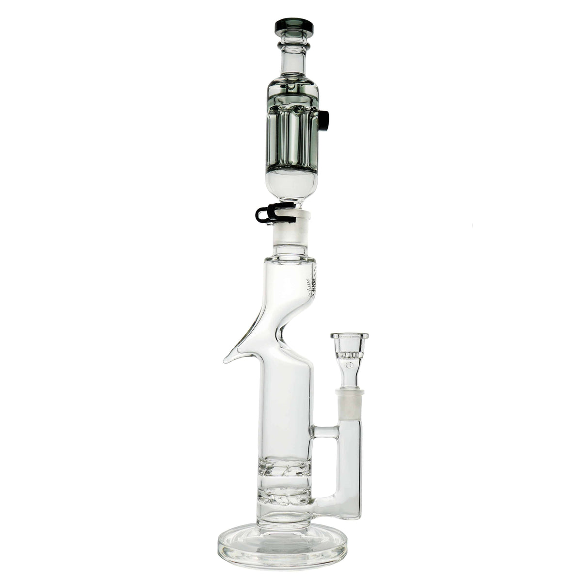 Boasting a sleek and ergonomic design the Tornado is low on maintenance and high on function. Easy to use, clean and hold this piece performs like a "big bong" without the hassle. Twin turbine percolators create a cyclone of filtration while a unique "Z" provides an organic handle for a smooth passing experience.