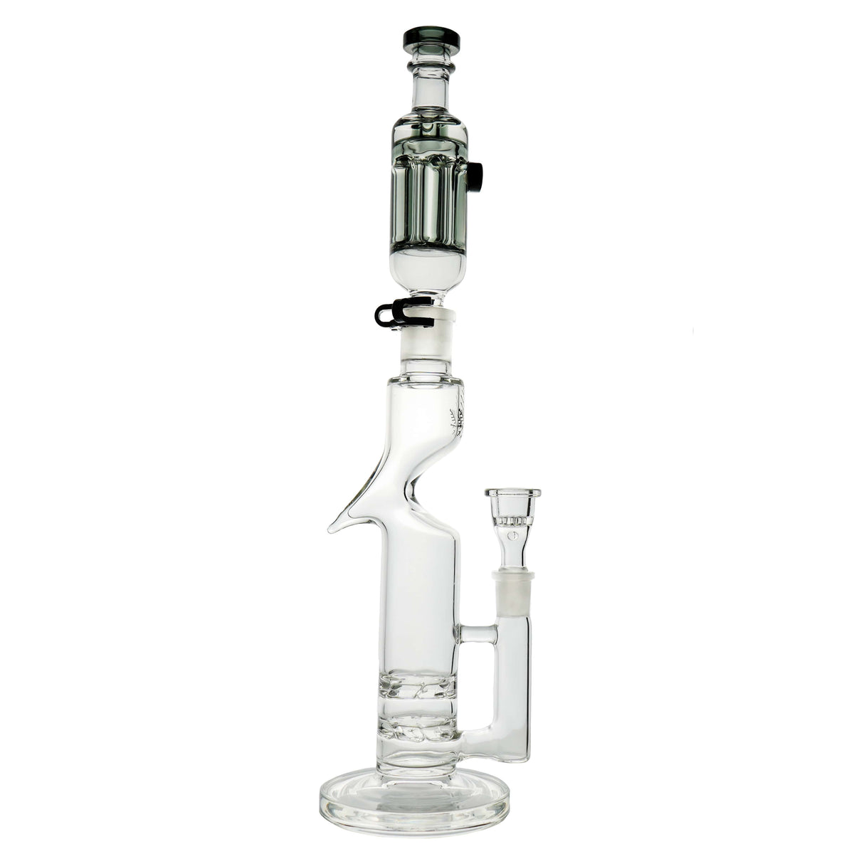 - Connect the joints of the glycerin chamber and the base. Then, grab the black clip and put the wider side of the clip on the base piece and the slimmer side on the glycerin chamber. Once in place, gently press down on the connector until it snaps into place.